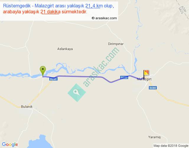 Rüstemgedik - Malazgirt arası yaklaşık olarak 90 km/h ile yukarıda belirtilen sürede olup, iki yerin kuş uçuşu uzaklığı (mesafesi) 20'dir. Yolculuk otobüsle 27 dakika sürmektedir.