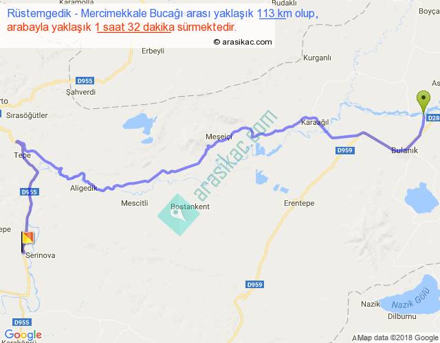 Rüstemgedik - Mercimekkale Bucağı arası yaklaşık olarak 90 km/h ile yukarıda belirtilen sürede olup, iki yerin kuş uçuşu uzaklığı (mesafesi) 73'dir. Yolculuk otobüsle 1 saat 59 dakika sürmektedir.