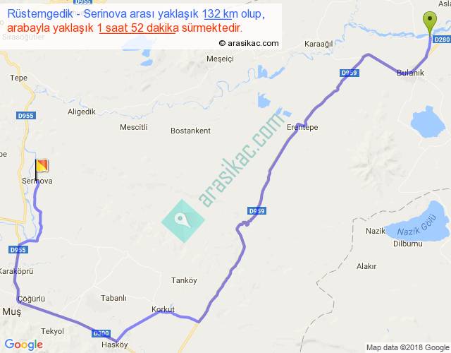 Rüstemgedik - Serinova arası yaklaşık olarak 90 km/h ile yukarıda belirtilen sürede olup, iki yerin kuş uçuşu uzaklığı (mesafesi) 70'dir. Yolculuk otobüsle 2 saat 25 dakika sürmektedir.