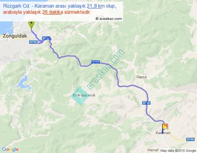 Rüzgarlı Cd. - Karaman arası yaklaşık olarak 90 km/h ile yukarıda belirtilen sürede olup, iki yerin kuş uçuşu uzaklığı (mesafesi) 15'dir. Yolculuk otobüsle 33 dakika sürmektedir.