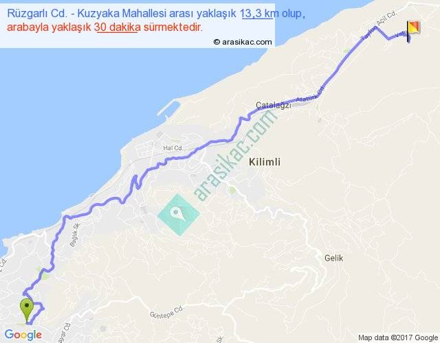 Rüzgarlı Cd. - Kuzyaka Mahallesi arası yaklaşık olarak 90 km/h ile yukarıda belirtilen sürede olup, iki yerin kuş uçuşu uzaklığı (mesafesi) 10'dir. Yolculuk otobüsle 39 dakika sürmektedir.