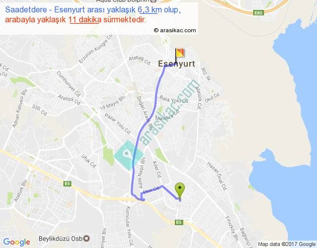 Saadetdere - Esenyurt arası yaklaşık olarak 90 km/h ile yukarıda belirtilen sürede olup, iki yerin kuş uçuşu uzaklığı (mesafesi) 4'dir. Yolculuk otobüsle 14 dakika sürmektedir.