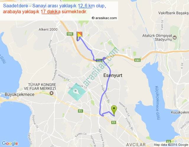 Saadetdere - Sanayi arası yaklaşık olarak 90 km/h ile yukarıda belirtilen sürede olup, iki yerin kuş uçuşu uzaklığı (mesafesi) 8'dir. Yolculuk otobüsle 22 dakika sürmektedir.