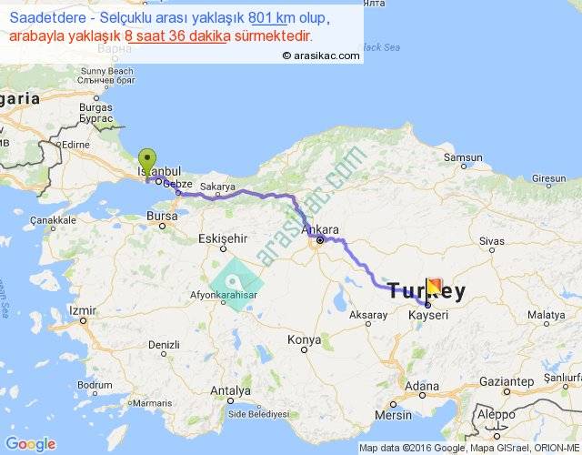 Saadetdere - Selçuklu arası yaklaşık olarak 90 km/h ile yukarıda belirtilen sürede olup, iki yerin kuş uçuşu uzaklığı (mesafesi) 629'dir. Eğer belirtilen yerler arasında uçak seferi var ise bu süre uçakla 58 dakika'ya kadar düşebilir. Yolculuk otobüsle 11 saat 10 dakika sürmektedir.