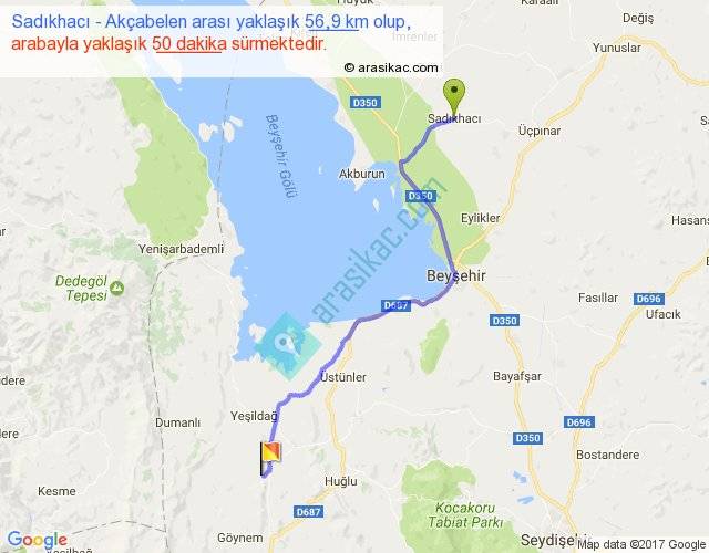 Sadıkhacı - Akçabelen arası yaklaşık olarak 90 km/h ile yukarıda belirtilen sürede olup, iki yerin kuş uçuşu uzaklığı (mesafesi) 44'dir. Yolculuk otobüsle 1 saat 5 dakika sürmektedir.