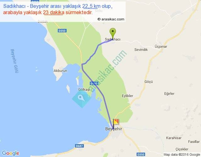 Sadıkhacı - Beyşehir arası yaklaşık olarak 90 km/h ile yukarıda belirtilen sürede olup, iki yerin kuş uçuşu uzaklığı (mesafesi) 17'dir. Yolculuk otobüsle 29 dakika sürmektedir.