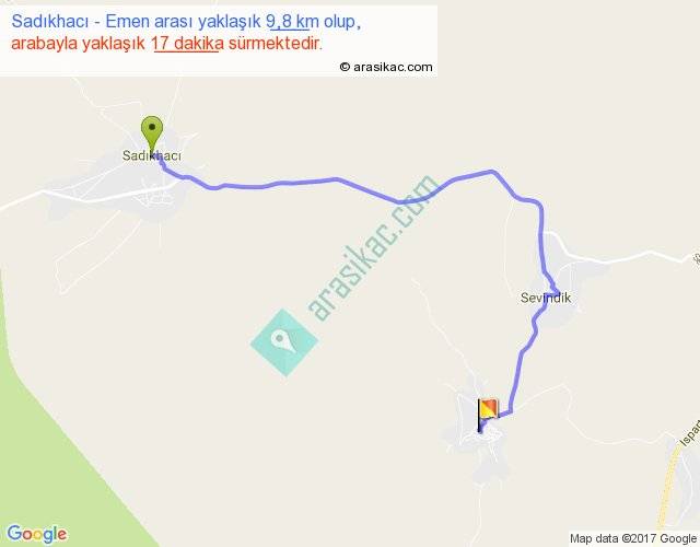 Sadıkhacı - Emen arası yaklaşık olarak 90 km/h ile yukarıda belirtilen sürede olup, iki yerin kuş uçuşu uzaklığı (mesafesi) 6'dir. Yolculuk otobüsle 22 dakika sürmektedir.