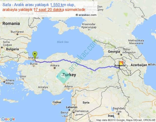 Safa - Aralık arası yaklaşık olarak 90 km/h ile yukarıda belirtilen sürede olup, iki yerin kuş uçuşu uzaklığı (mesafesi) 1289'dir. Eğer belirtilen yerler arasında uçak seferi var ise bu süre uçakla 1 saat 58 dakika'ya kadar düşebilir. Yolculuk otobüsle 22 saat 32 dakika sürmektedir.