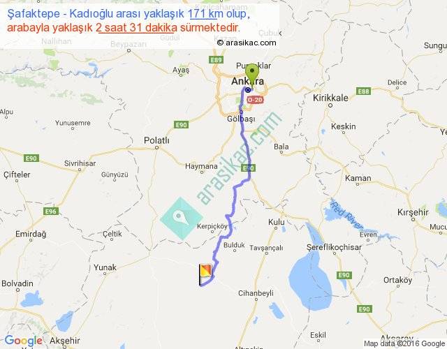 Şafaktepe - Kadıoğlu arası yaklaşık olarak 90 km/h ile yukarıda belirtilen sürede olup, iki yerin kuş uçuşu uzaklığı (mesafesi) 136'dir. Yolculuk otobüsle 3 saat 16 dakika sürmektedir.
