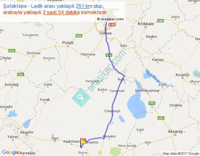 Şafaktepe - Ladik arası yaklaşık olarak 90 km/h ile yukarıda belirtilen sürede olup, iki yerin kuş uçuşu uzaklığı (mesafesi) 198'dir. Yolculuk otobüsle 3 saat 46 dakika sürmektedir.