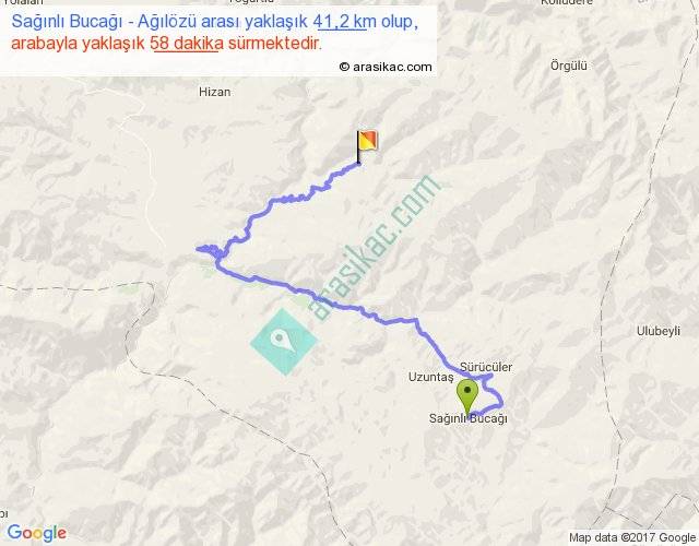 Sağınlı Bucağı - Ağılözü arası yaklaşık olarak 90 km/h ile yukarıda belirtilen sürede olup, iki yerin kuş uçuşu uzaklığı (mesafesi) 15'dir. Yolculuk otobüsle 1 saat 15 dakika sürmektedir.