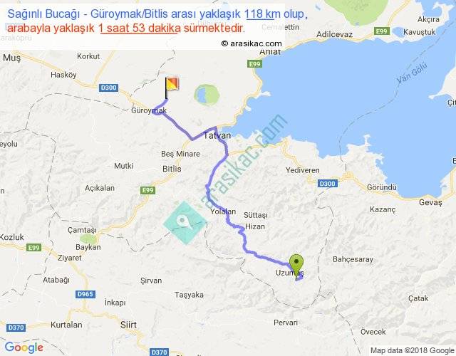Sağınlı Bucağı - Güroymak Bitlis arası yaklaşık olarak 90 km/h ile yukarıda belirtilen sürede olup, iki yerin kuş uçuşu uzaklığı (mesafesi) 74'dir. Yolculuk otobüsle 2 saat 26 dakika sürmektedir.