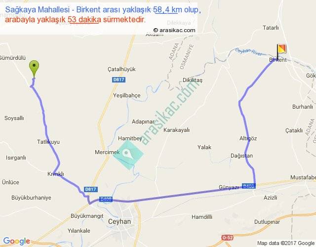Sağkaya Mahallesi - Birkent arası yaklaşık olarak 90 km/h ile yukarıda belirtilen sürede olup, iki yerin kuş uçuşu uzaklığı (mesafesi) 30'dir. Yolculuk otobüsle 1 saat 8 dakika sürmektedir.