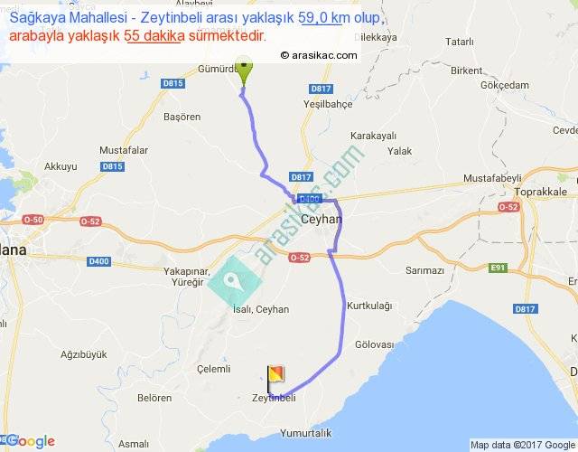 Sağkaya Mahallesi - Zeytinbeli arası yaklaşık olarak 90 km/h ile yukarıda belirtilen sürede olup, iki yerin kuş uçuşu uzaklığı (mesafesi) 41'dir. Yolculuk otobüsle 1 saat 11 dakika sürmektedir.