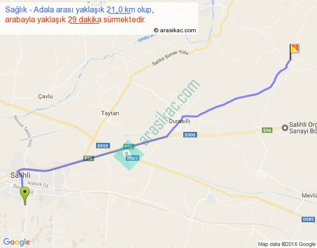 Sağlık - Adala arası yaklaşık olarak 90 km/h ile yukarıda belirtilen sürede olup, iki yerin kuş uçuşu uzaklığı (mesafesi) 18'dir. Yolculuk otobüsle 37 dakika sürmektedir.