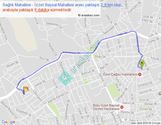Sağlık Mahallesi - İzzet Baysal Mahallesi arası yaklaşık olarak 90 km/h ile yukarıda belirtilen sürede olup, iki yerin kuş uçuşu uzaklığı (mesafesi) 2'dir. Yolculuk otobüsle 7 dakika sürmektedir.