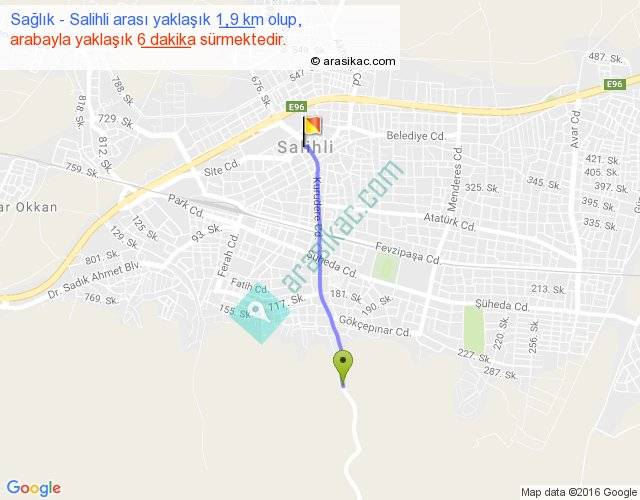 Sağlık - Salihli arası yaklaşık olarak 90 km/h ile yukarıda belirtilen sürede olup, iki yerin kuş uçuşu uzaklığı (mesafesi) 2'dir. Yolculuk otobüsle 7 dakika sürmektedir.