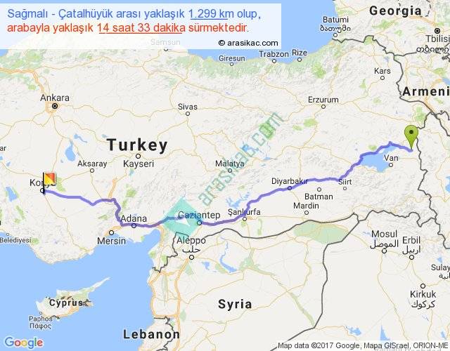 Sağmalı - Çatalhüyük arası yaklaşık olarak 90 km/h ile yukarıda belirtilen sürede olup, iki yerin kuş uçuşu uzaklığı (mesafesi) 1002'dir. Eğer belirtilen yerler arasında uçak seferi var ise bu süre uçakla 1 saat 32 dakika'ya kadar düşebilir. Yolculuk otobüsle 18 saat 54 dakika sürmektedir.
