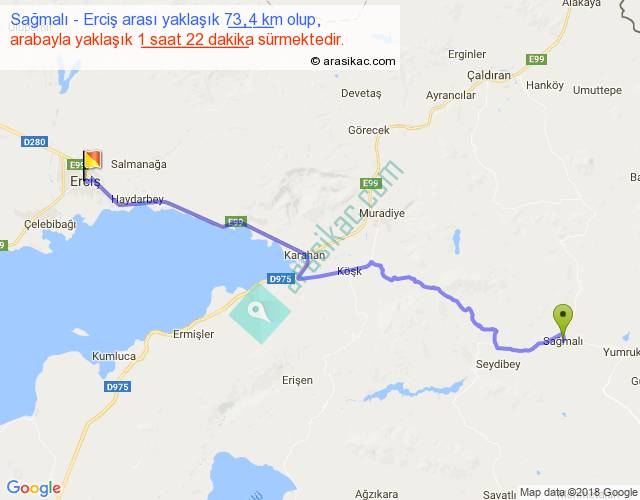 Sağmalı - Erciş arası yaklaşık olarak 90 km/h ile yukarıda belirtilen sürede olup, iki yerin kuş uçuşu uzaklığı (mesafesi) 59'dir. Yolculuk otobüsle 1 saat 46 dakika sürmektedir.
