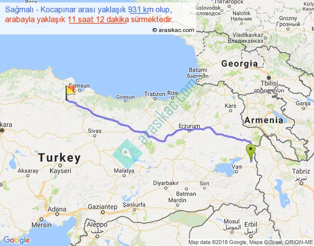 Sağmalı - Kocapınar arası yaklaşık olarak 90 km/h ile yukarıda belirtilen sürede olup, iki yerin kuş uçuşu uzaklığı (mesafesi) 736'dir. Eğer belirtilen yerler arasında uçak seferi var ise bu süre uçakla 1 saat 07 dakika'ya kadar düşebilir. Yolculuk otobüsle 14 saat 33 dakika sürmektedir.
