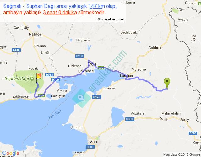 Sağmalı - Süphan Dağı arası yaklaşık olarak 90 km/h ile yukarıda belirtilen sürede olup, iki yerin kuş uçuşu uzaklığı (mesafesi) 98'dir. Yolculuk otobüsle 3 saat 54 dakika sürmektedir.