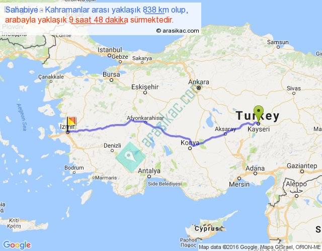 Sahabiye - Kahramanlar arası yaklaşık olarak 90 km/h ile yukarıda belirtilen sürede olup, iki yerin kuş uçuşu uzaklığı (mesafesi) 721'dir. Eğer belirtilen yerler arasında uçak seferi var ise bu süre uçakla 1 saat 06 dakika'ya kadar düşebilir. Yolculuk otobüsle 12 saat 44 dakika sürmektedir.