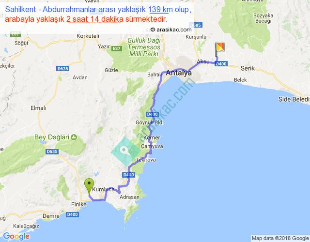 Sahilkent - Abdurrahmanlar arası yaklaşık olarak 90 km/h ile yukarıda belirtilen sürede olup, iki yerin kuş uçuşu uzaklığı (mesafesi) 95'dir. Yolculuk otobüsle 2 saat 54 dakika sürmektedir.