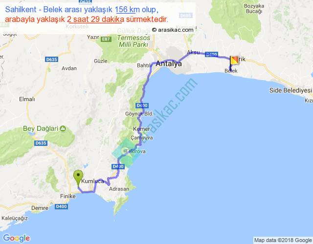 Sahilkent - Belek arası yaklaşık olarak 90 km/h ile yukarıda belirtilen sürede olup, iki yerin kuş uçuşu uzaklığı (mesafesi) 96'dir. Yolculuk otobüsle 3 saat 13 dakika sürmektedir.