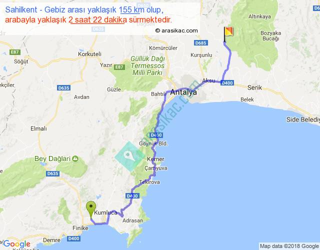 Sahilkent - Gebiz arası yaklaşık olarak 90 km/h ile yukarıda belirtilen sürede olup, iki yerin kuş uçuşu uzaklığı (mesafesi) 108'dir. Yolculuk otobüsle 3 saat 4 dakika sürmektedir.