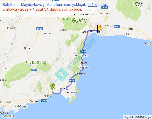 Sahilkent - Meydankavağı Mahallesi arası yaklaşık olarak 90 km/h ile yukarıda belirtilen sürede olup, iki yerin kuş uçuşu uzaklığı (mesafesi) 76'dir. Yolculuk otobüsle 2 saat 28 dakika sürmektedir.