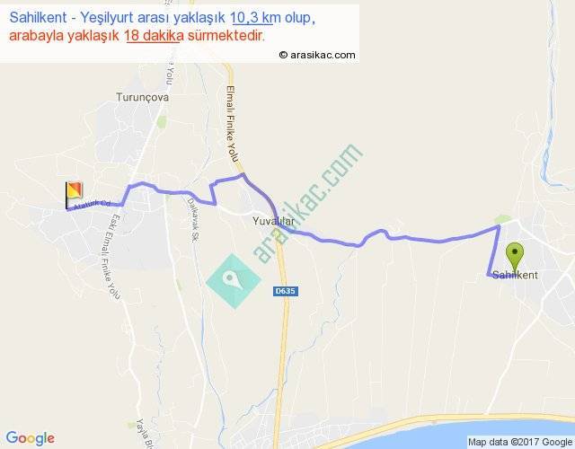 Sahilkent - Yeşilyurt arası yaklaşık olarak 90 km/h ile yukarıda belirtilen sürede olup, iki yerin kuş uçuşu uzaklığı (mesafesi) 8'dir. Yolculuk otobüsle 23 dakika sürmektedir.