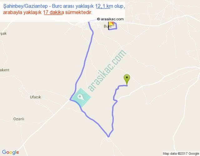 Şahinbey Gaziantep - Burc arası yaklaşık olarak 90 km/h ile yukarıda belirtilen sürede olup, iki yerin kuş uçuşu uzaklığı (mesafesi) 3'dir. Yolculuk otobüsle 22 dakika sürmektedir.