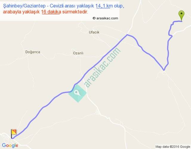 Şahinbey Gaziantep - Cevizli arası yaklaşık olarak 90 km/h ile yukarıda belirtilen sürede olup, iki yerin kuş uçuşu uzaklığı (mesafesi) 10'dir. Yolculuk otobüsle 20 dakika sürmektedir.