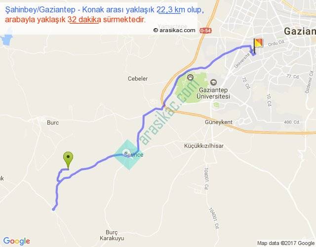 Şahinbey Gaziantep - Konak arası yaklaşık olarak 90 km/h ile yukarıda belirtilen sürede olup, iki yerin kuş uçuşu uzaklığı (mesafesi) 13'dir. Yolculuk otobüsle 41 dakika sürmektedir.