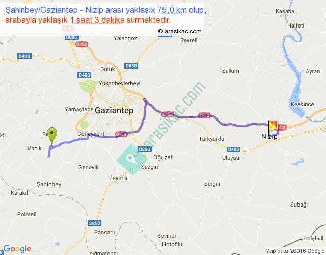 Şahinbey Gaziantep - Nizip arası yaklaşık olarak 90 km/h ile yukarıda belirtilen sürede olup, iki yerin kuş uçuşu uzaklığı (mesafesi) 52'dir. Yolculuk otobüsle 1 saat 21 dakika sürmektedir.