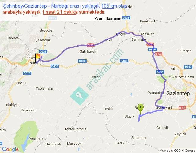 Şahinbey Gaziantep - Nurdağı arası yaklaşık olarak 90 km/h ile yukarıda belirtilen sürede olup, iki yerin kuş uçuşu uzaklığı (mesafesi) 46'dir. Yolculuk otobüsle 1 saat 45 dakika sürmektedir.