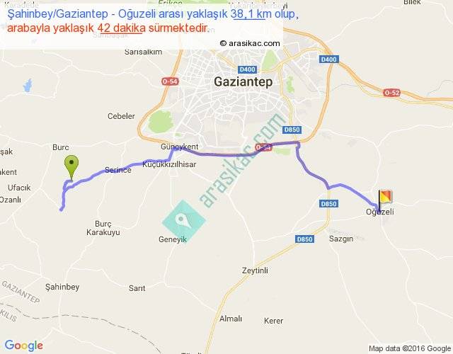 Şahinbey Gaziantep - Oğuzeli arası yaklaşık olarak 90 km/h ile yukarıda belirtilen sürede olup, iki yerin kuş uçuşu uzaklığı (mesafesi) 27'dir. Yolculuk otobüsle 54 dakika sürmektedir.