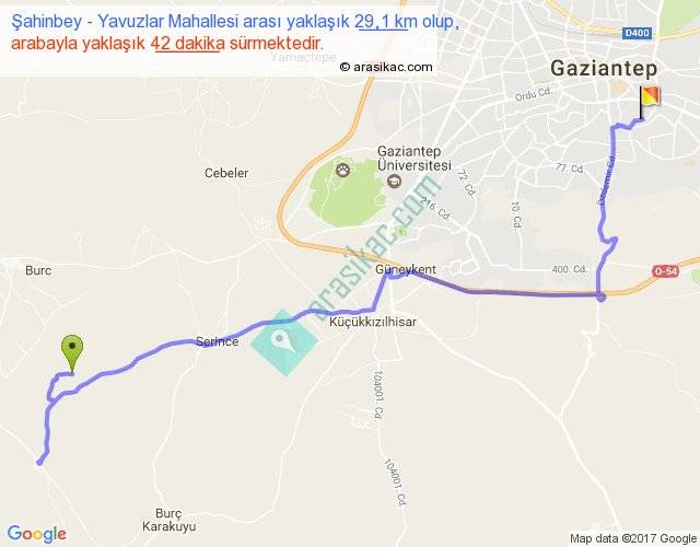 Şahinbey - Yavuzlar Mahallesi arası yaklaşık olarak 90 km/h ile yukarıda belirtilen sürede olup, iki yerin kuş uçuşu uzaklığı (mesafesi) 17'dir. Yolculuk otobüsle 54 dakika sürmektedir.