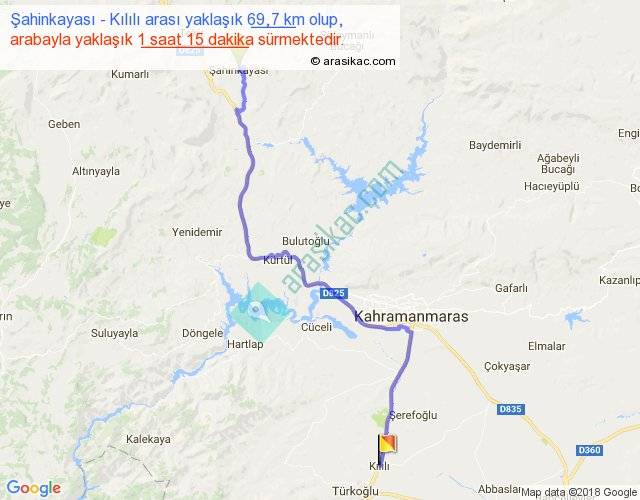 Şahinkayası - Kılılı arası yaklaşık olarak 90 km/h ile yukarıda belirtilen sürede olup, iki yerin kuş uçuşu uzaklığı (mesafesi) 50'dir. Yolculuk otobüsle 1 saat 37 dakika sürmektedir.