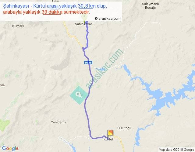 Şahinkayası - Kürtül arası yaklaşık olarak 90 km/h ile yukarıda belirtilen sürede olup, iki yerin kuş uçuşu uzaklığı (mesafesi) 23'dir. Yolculuk otobüsle 50 dakika sürmektedir.