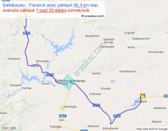 Şahinkayası - Pazarcık arası yaklaşık olarak 90 km/h ile yukarıda belirtilen sürede olup, iki yerin kuş uçuşu uzaklığı (mesafesi) 66'dir. Yolculuk otobüsle 2 saat 0 dakika sürmektedir.