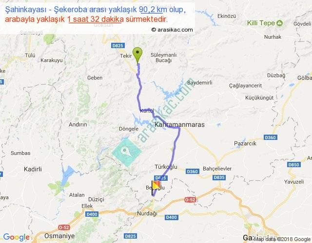 Şahinkayası - Şekeroba arası yaklaşık olarak 90 km/h ile yukarıda belirtilen sürede olup, iki yerin kuş uçuşu uzaklığı (mesafesi) 65'dir. Yolculuk otobüsle 1 saat 59 dakika sürmektedir.