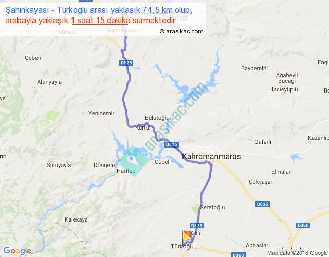 Şahinkayası - Türkoğlu arası yaklaşık olarak 90 km/h ile yukarıda belirtilen sürede olup, iki yerin kuş uçuşu uzaklığı (mesafesi) 52'dir. Yolculuk otobüsle 1 saat 37 dakika sürmektedir.