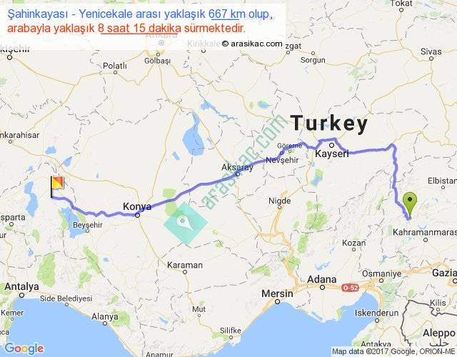Şahinkayası - Yenicekale arası yaklaşık olarak 90 km/h ile yukarıda belirtilen sürede olup, iki yerin kuş uçuşu uzaklığı (mesafesi) 481'dir. Eğer belirtilen yerler arasında uçak seferi var ise bu süre uçakla 44 dakika'ya kadar düşebilir. Yolculuk otobüsle 10 saat 43 dakika sürmektedir.