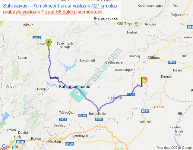 Şahinkayası - Yumaklıcerit arası yaklaşık olarak 90 km/h ile yukarıda belirtilen sürede olup, iki yerin kuş uçuşu uzaklığı (mesafesi) 80'dir. Yolculuk otobüsle 2 saat 30 dakika sürmektedir.