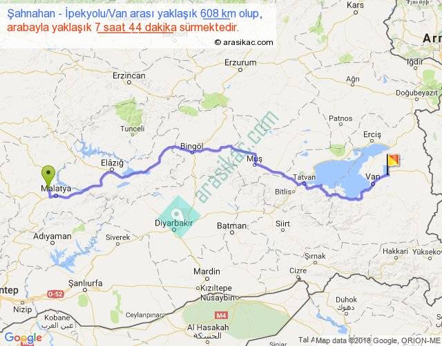 Şahnahan - İpekyolu Van arası yaklaşık olarak 90 km/h ile yukarıda belirtilen sürede olup, iki yerin kuş uçuşu uzaklığı (mesafesi) 468'dir. Eğer belirtilen yerler arasında uçak seferi var ise bu süre uçakla 43 dakika'ya kadar düşebilir. Yolculuk otobüsle 10 saat 3 dakika sürmektedir.