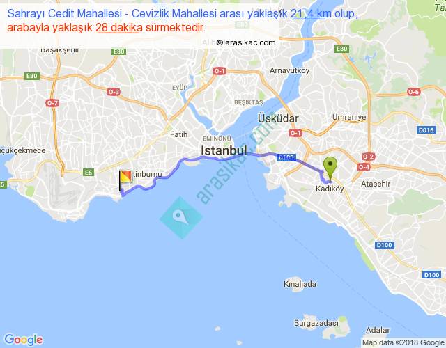 Sahrayı Cedit Mahallesi - Cevizlik Mahallesi arası yaklaşık olarak 90 km/h ile yukarıda belirtilen sürede olup, iki yerin kuş uçuşu uzaklığı (mesafesi) 17'dir. Yolculuk otobüsle 36 dakika sürmektedir.