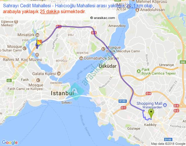 Sahrayı Cedit Mahallesi - Halıcıoğlu Mahallesi arası yaklaşık olarak 90 km/h ile yukarıda belirtilen sürede olup, iki yerin kuş uçuşu uzaklığı (mesafesi) 13'dir. Yolculuk otobüsle 32 dakika sürmektedir.