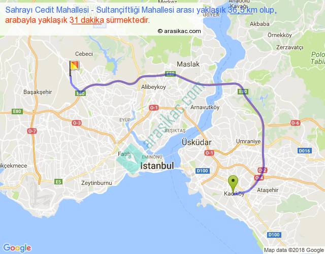 Sahrayı Cedit Mahallesi - Sultançiftliği Mahallesi arası yaklaşık olarak 90 km/h ile yukarıda belirtilen sürede olup, iki yerin kuş uçuşu uzaklığı (mesafesi) 23'dir. Yolculuk otobüsle 40 dakika sürmektedir.
