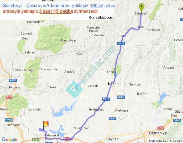 Saimbeyli - Çukurova Adana arası yaklaşık olarak 90 km/h ile yukarıda belirtilen sürede olup, iki yerin kuş uçuşu uzaklığı (mesafesi) 128'dir. Yolculuk otobüsle 3 saat 39 dakika sürmektedir.